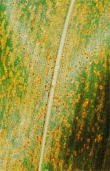 Geographical Range: Southern corn rust can be found generally through the southern U.S and further south wherever corn is grown in warm/humid regions. Symptoms: As seen on photo at the top of the page, southern corn rust can be detrimental to photosynthesis and overall productivity of a corn plant. The most obvious symptoms are dark, reddish pustules which can be scattered over the top of corn leaves. This is a major difference from Northern corn leaf rust where pustules can form on the upper and lower surface of leaves. These pustules can be found on corn husks but are generally found on the leaves. Southern rust pustules are smaller, more round and reddish in color when compared to common rust. Dissemination: The plant pathogen being examined here is generally carried to other plants by wind. Strong southerly winds carry spores to infect susceptible fields in other areas. Infected plant material which is transported on machinery can also allow for primary inoculum to spread to new areas. However, southern corn rust spores don't survive the midwestern winters on crop residue. Disease Cycle: Southern rust develops more quickly and is more detrimental to leaves than common rust. Uredo spores are blown as primary inoculum and infect northern corn fields if the temperature is right for development. Southern rust is favored by periods of high relative humidity and high temperatures, usually, between 80 and 90 degrees F. The disease can develop very quickly during hot, moist conditions. Southern rust occurs generally later in the year and is more common in southern states. Southern rust incidence is not as common as common rust, but the effects on corn fields are more severe when it is present. Click here for a complete disease cycle of Southern Corn Rust. Control Measures: Southern corn rust rarely needs control as the pathogen is hit or miss in northern states. Most problems with common rust are not serious enough to warrant control. If a problem area has been identified however, southern leaf rust resistant hybrids are available. Fungicides are available for rust control for areas with extreme problems. A farmer may consider planting as early as possible in the season so as to ensure plants will be more developed if conditions warrant rust development. Recent Research-Summary: Related Journal Article: Holland,-J.B.; Uhr,-D.V.; Jeffers,-D.; Goodman,-M.M. 1998. Inheritance of resistance to southern corn rust in tropical-by-corn-belt maize populations. Springer-Verlag. 96:232-231. The reason for the study performed here was observe the resistance inheritance within several corn populations to southern corn rust. The study was accomplished by crossing two temperate inbred lines to a susceptible dent hybrid. The inbred lines had good ratings of resistance to Puccinia polysora. Hybrid resistance was measured by counting pustules on seedlings that were grown in a greenhouse. Neither source of resistance was completely effective against southern corn leaf rust which prevented determination of the alleles of the two genes suspect for resistance. It was determined that both sources of inbred lines had better resistance to southern rust than the susceptible hybrids. Sources: Agrios, George N. 1997. Plant Pathology 4 ed. Academic Press. Pioneer Web site.
